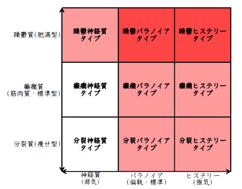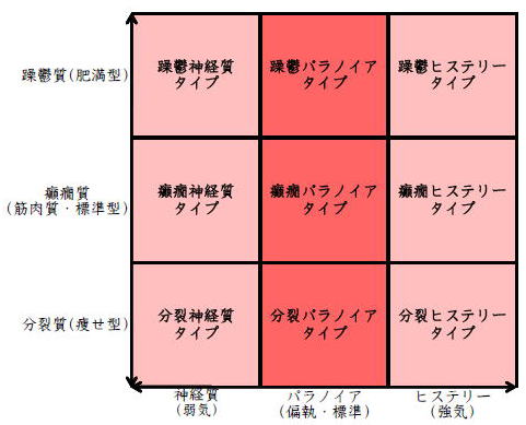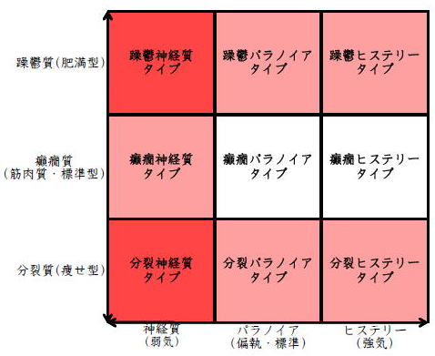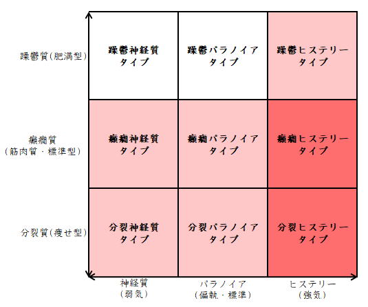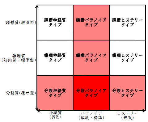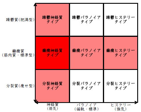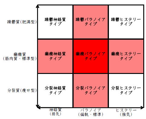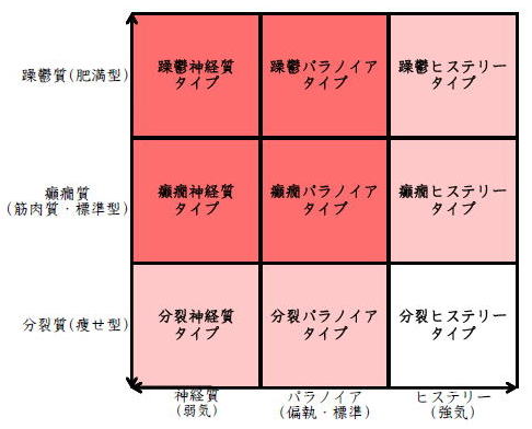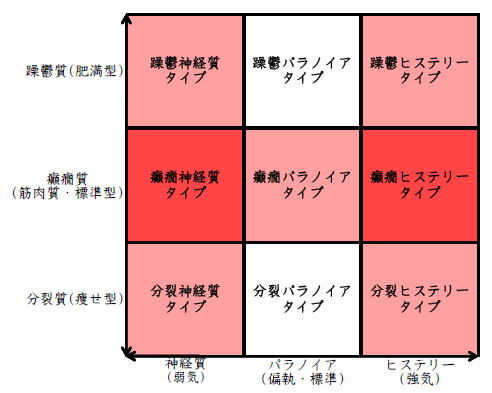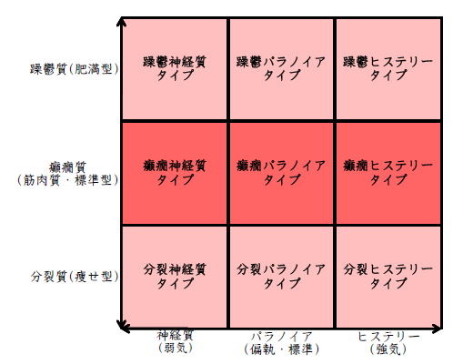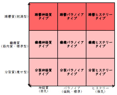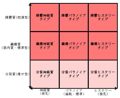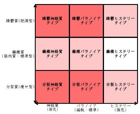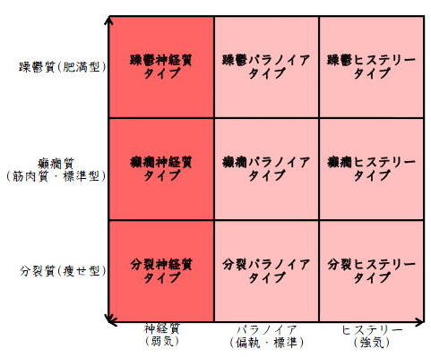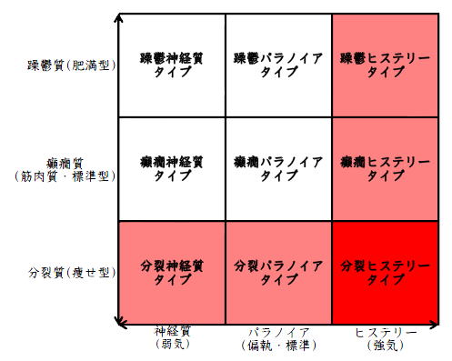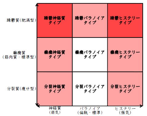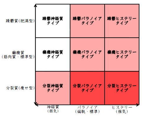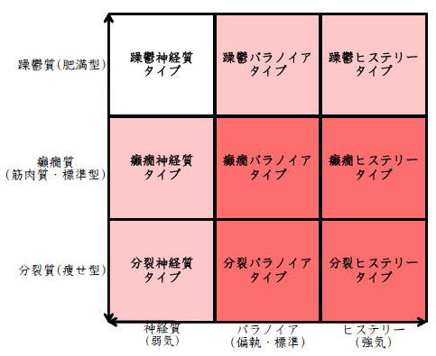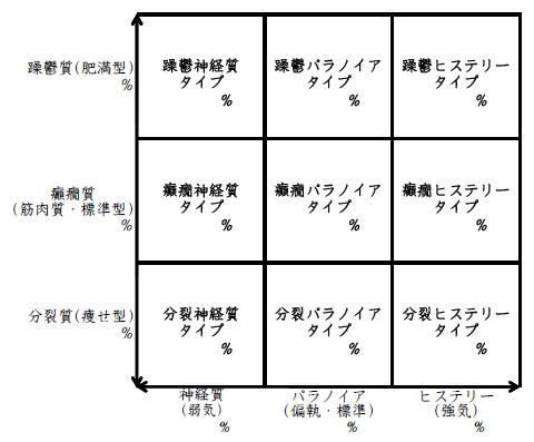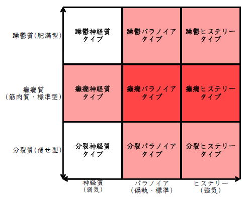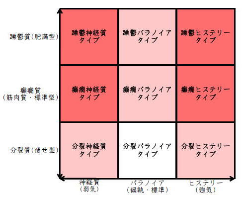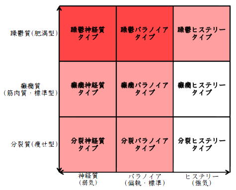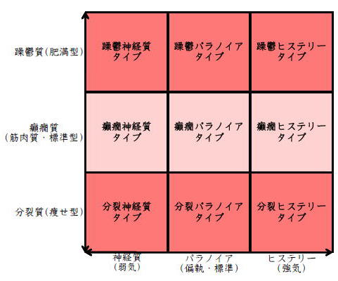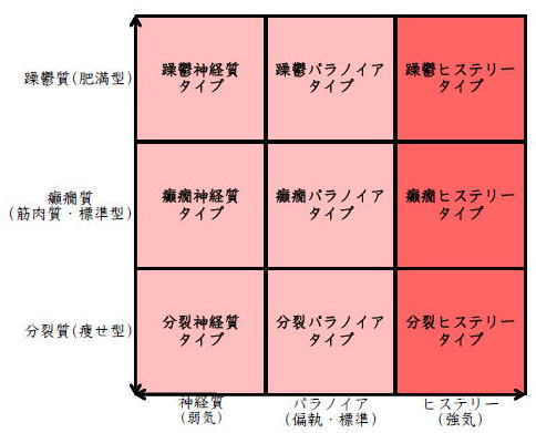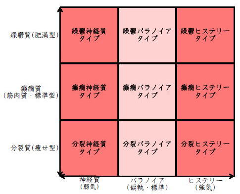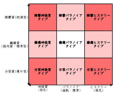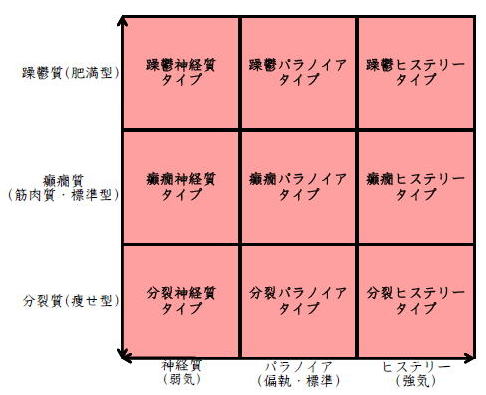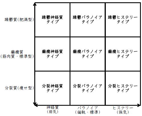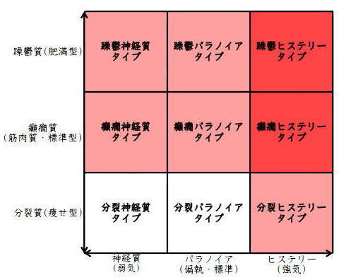 ![]() デカルト座標に拠るクレッチマー分類概略 性格分類は人をよく知ってその特徴を理解し、よりよい人生を歩む為の技術である。 性格分類はそもそもギリシャ時代医学の祖であるヒポクラテスの血液、粘液、黄胆汁、黒胆汁の四体液説等から既に始まり数千年の変遷を経てクレッチマーの躁鬱質、癲癇質、分裂質にその答えをみいだし心理学や精神医学の基礎となった。 しかしながらクレッチマーの性格分類も基礎的に用いるだけでは類型が少なすぎて多様な人間性格の実情の答えにならず論者はその答えになる性格分析を追求していた。 すると人間性格を9種類に分類する実用性が高いがやや科学性に乏しいエニアグラムを参考にして分類に優れた肥満型に多い躁鬱質・筋骨型に多い癲癇質・細長型に多い分裂質のクレッチマー分類と弱気の神経質・中間性質偏執のパラノイア・勝ち気のヒステリーの病理性格分類をベクトル座標分類して統合解析した性格理論がエニアグラムの科学的分類法となりより類型の多い性格分類法に発展するという解となった。 こうして分類に優れた躁鬱質・癲癇質・分裂質のクレッチマー分類と神経質・パラノイア・ヒステリーの病理性格分類をベクトル座標分類して統合し性格判断を作成した。性格分析の詳細における参考文献は主にデータベースの豊富な鈴木秀子氏のエニアグラムに関する著書を、性格と気質に関しては宮城音弥氏の著書『性格』。どちらも非常に優れた著作なので読本を推奨する。マトリックス作成のヒントを与えて下さった佐藤隆法氏に感謝の意を表する。研究が、いや全ての営みが先人の功績に依るところが多く今研究も『躁鬱質・癲癇質・分裂質のクレッチマー分類と神経質・パラノイア・ヒステリーの病理学分類をエニアグラムと統合しベクトル座標分類を行った性格分析理論』と称する。 性格分類とエニアグラム分類の性質 クレッチマー分類 ○躁鬱質 一般に肥満型に多く善良、温和であるが気分の浮き沈みが多く、愉快な時(躁)と落ち込む時(鬱)が交互に訪れるという特徴がある。 行為形式やコミュニケーションを主に感情で行う。 ![]() ○癲癇質 一般に中肉、筋骨型で保守と組織型の傾向があり一般に丁寧で義理堅いが時に激怒する傾向がある。行為形式やコミュニケーションを主に本能で行う。 ![]() ○分裂質 一般に痩せ形で繊細さと鈍感さ、熱狂と冷静など、文字通り性格に極端な両端が内在してスイッチのように頻繁に肯定感情と否定感情が変じる。行為形式やコミュニケーションを主に思考で行う。 ![]() 気質は躁鬱質と癲癇質と分裂質の性格保持の比率と程度により様々な形態に変化する。 ![]() ![]() ![]() ![]() 病理性格分類 ○神経質 内向型で劣等感(不完全感情)が強く、おずおずとしていて強迫観念や恐怖症がある(弱気)。 ○パラノイア 中間性格で所属する組織に馴染んでいるが、それが極端になると自我が肥大して自身が所属する組織や自身の考えに執着し非社会型の反応を示す(偏執・標準)。 ○ヒステリー 外向型でアグレッシヴ、勝負事を好む傾向があり虚栄心が強い(強気)。 神経質・パラノイア・ヒステリー性格も性格保持の比率と程度により様々な性質を示す。 エニアグラム分類との関連 ![]() ○癲癇 神経質タイプ=タイプ1完全でありたい人 完全を志向し不完全に対する怒りを抱えている人でありながら、組織に忠実であり怒りを回避する人である。組織型であり怒りが特徴という点が癲癇質の気質を、不完全感情が神経質性格を示している。 ○躁鬱パラノイアタイプ=タイプ2人の助けになりたい人 情が深く人々の手助けをする人であり、相手によって幾つもの自分を演じ分ける人である。情が深いという特徴が躁鬱質の気質を、相手によって自分を変えられるという性質が中間性格であり順応型であるパラノイアの性格を示している。 ○躁鬱 ヒステリータイプ=タイプ3成功を追い求める人 成功するためにいかなる努力も惜しまず、その成功で得られる周囲からの評価や愛情を必要とする人。周囲との関係性を生き甲斐とする特徴が躁鬱質を、成功という外界での成果にこだわる特徴がヒステリー性格を示している。 ○躁鬱 神経質タイプ=タイプ4特別な存在であろうとする人 感性が豊かで思いやりがあるが自分の存在の矮小さを感じていて鬱の状態になりやすい人。感情での行為形式や鬱という状態が躁鬱質の気質を、自身の矮小さを感じる劣等感が神経質の性格を示す。 ○分裂パラノイアタイプ=タイプ5知識を得て観察する人 知識を蓄えることを好み観察や分析を得意とするが人との交わりによそよそしさがある人。思考で行為を行う点が分裂質の気質を、外界から遠ざかり自身の思考に固執する点と内向外向における中間性質がパラノイアの性格を示す。 ○ 分裂 神経質タイプ=タイプ6安全を求め慎重に行動する人 安全を求めグループに忠実だが自身を保護する権力に対して恐怖と不信を同時に抱いている人。従順と抗いという思考における